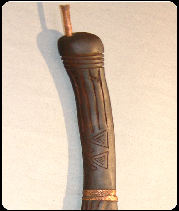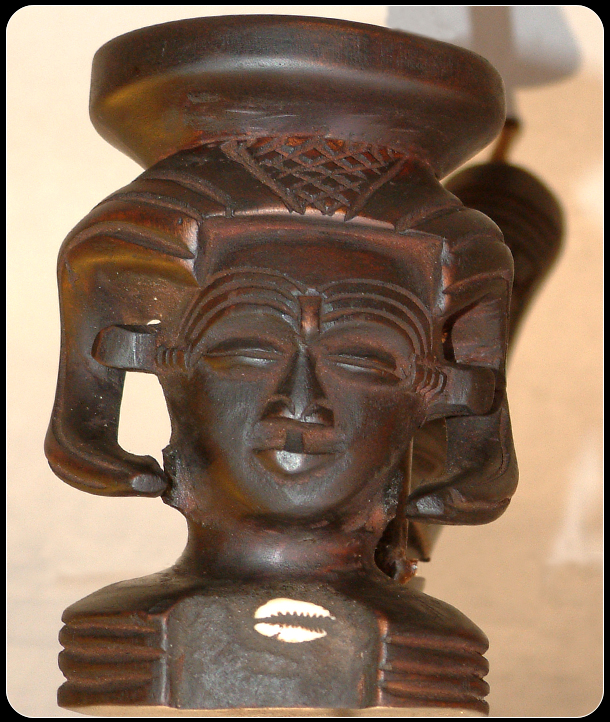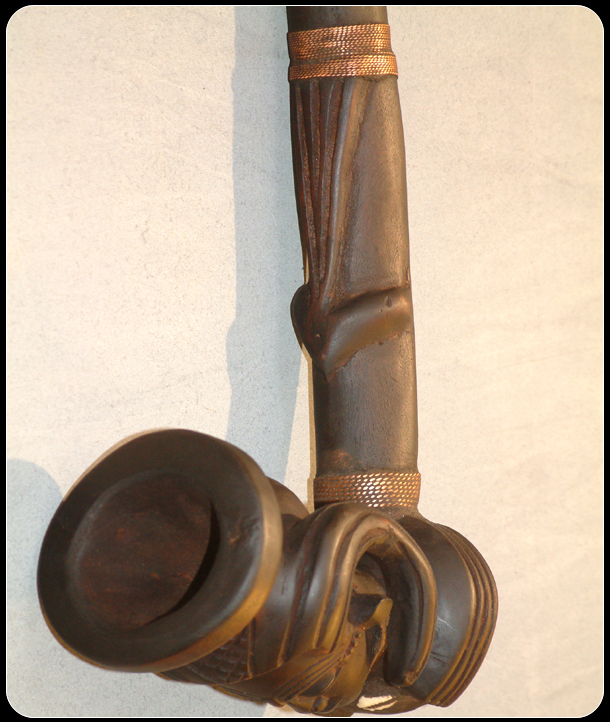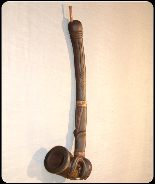 The Kuba tribe is part of the Bukuba, which is a confederation of around eighteen ethnic groups in Zaire. Each ethnic group maintains their own individual style of African art. The pipe features a woman with scarification marks on her forehead and an elaborate headdress, which has geometric designs, which is a highly favorite form of decoration, used by the Kuba tribe. A currie shell, which symbolizes wealth, has been imbedded in chest. The remainder of the pipe has been further decorated with geometric designs and copper coils.