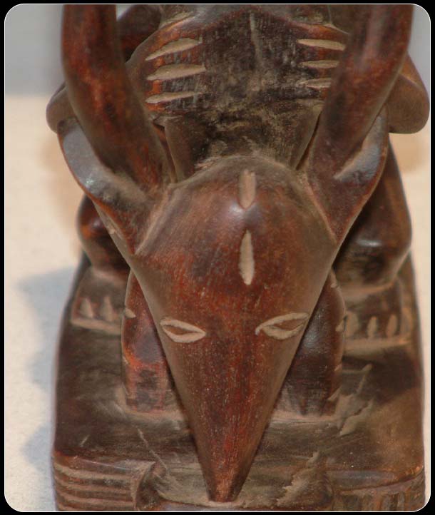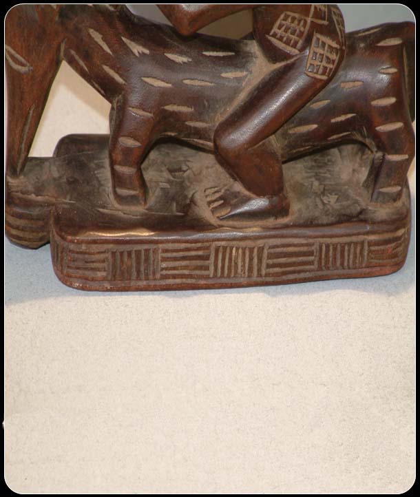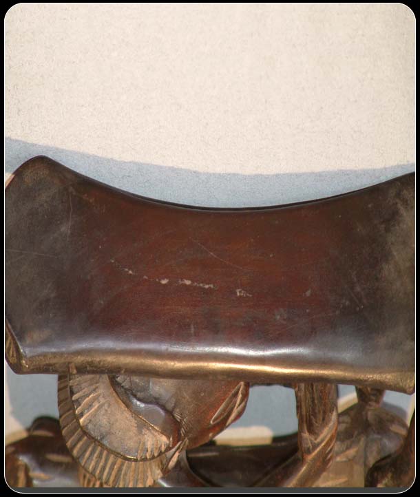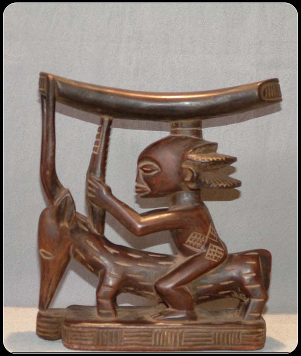 This headrest originates from the Luba (Baluba) tribe of Zaire also known as the Democratic Republic of Congo. The Baluba people believed that their ancestors could communicate with them through dreams, thus headrests were sometimes called ‘seats of dreams’. Headrests were also used to preserve elaborate hairstyles, which were traditional among the Baluba people. The majority of Baluba art was made for kings and chiefs and as such the headrests were prized possessions of this group as it was personal to them, so much so that upon their deaths the headrests would sometimes be buried with them. The flamboyance of the headrest and the coiffeur of the figure acted as attestation to the importance of the owner. It can be seen that the coiffure of the figure on this headrest is quite elaborate as is the antelope on which the figure is sat upon. It can therefore be hypothesised that the original owner of this headrest could have been someone of some importance. This headrest has a rich patina and displays signs of usage, which does not detract from that fact that it a beautifully crafted piece of Baluba art.